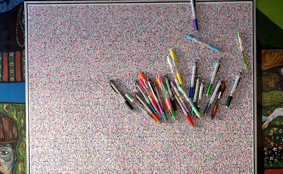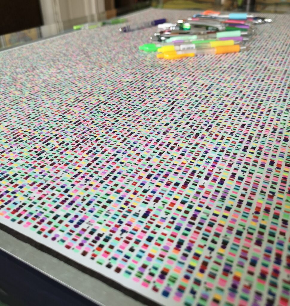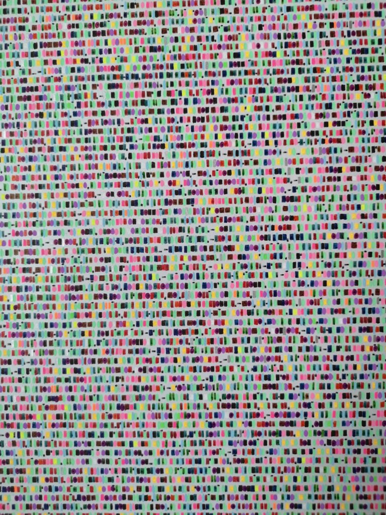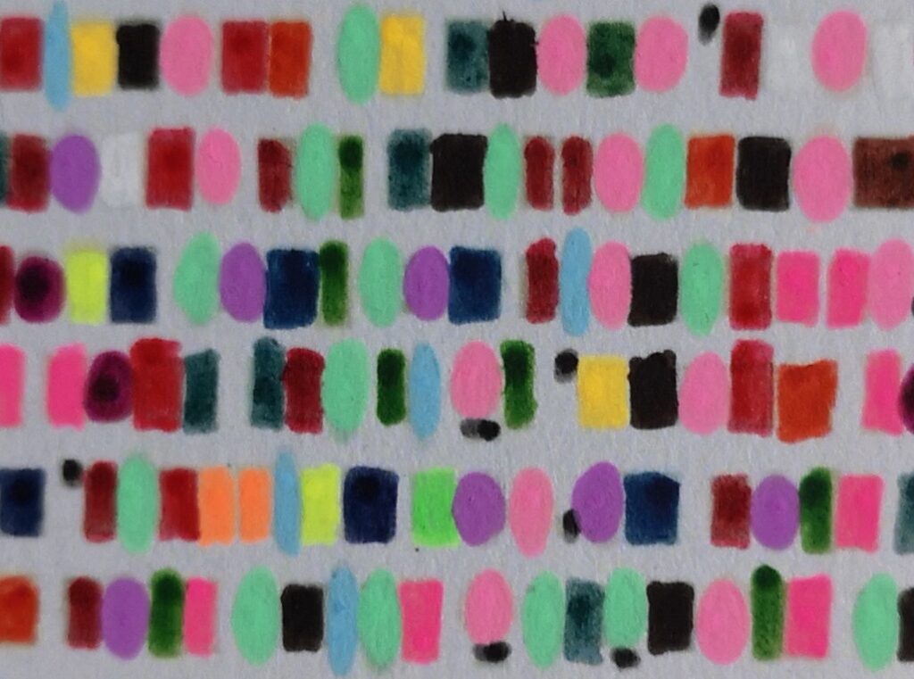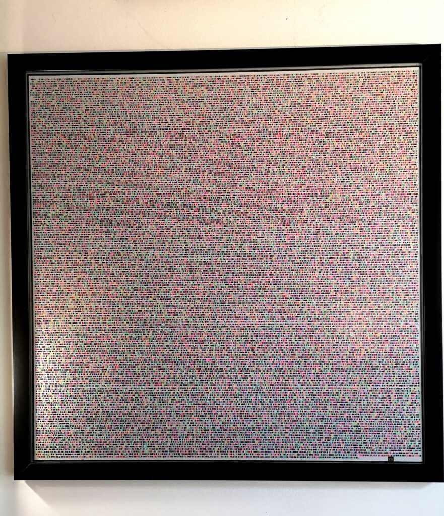 “Painting with the colors of words” has always been the phrase that identifies my works. It came to mind right away, when in 2008 I began to think about the possibility of giving life to a sort of merging between literary text and figurative art through handwriting. Since about a year, this motto has taken on an even more precise and “meaningfull” sens, thanks to some new works that represent, in my opinion, a step forward in my artistic path. In these new works, the handwriting of the literary text has given way to the “colored hatching” of the text itself. In other words, I created a colored alphabet, assigning each letter a specific color based on my personal synaesthetic perception, that is, the association of two elements belonging to two different sensory spheres. So, for example, the letter “A” has become the color pink, the letter “G” the color orange, the letter “R” red, the letter “C” blue, and so on. 26 letters of the Latin/Anglo-Saxon alphabet transformed into 26 different shades of color.