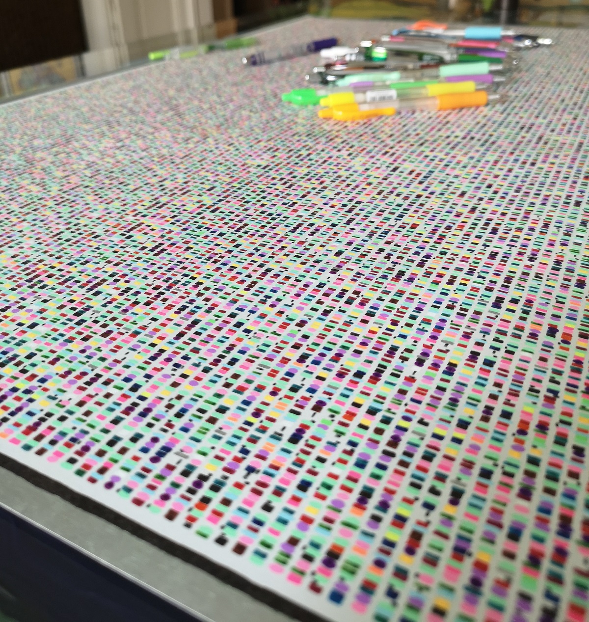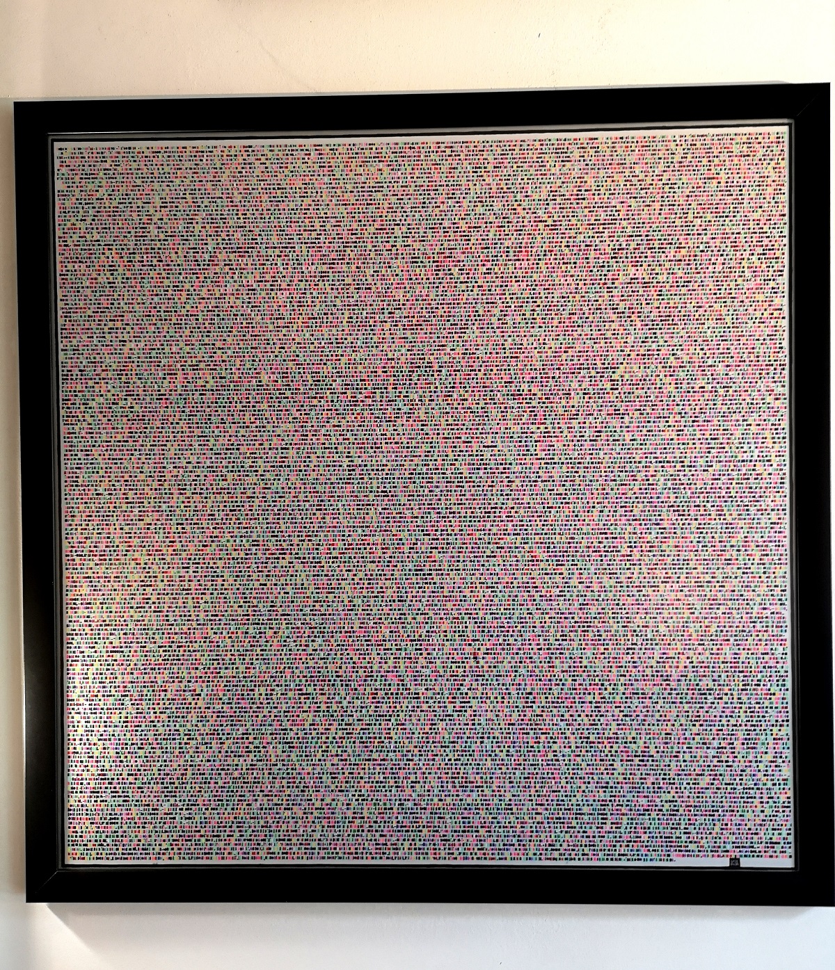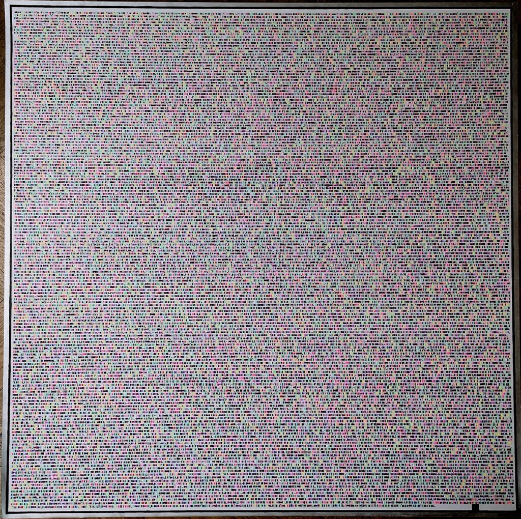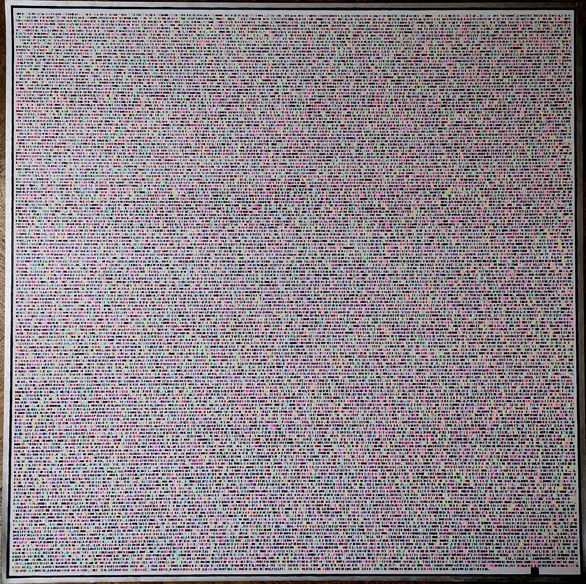 The result is an abstract image, which presents a different overall tone depending on the language used. The frequency with which certain letters recur depending on the language used is in fact very different. In Italian, for example, the letters “O” (corresponding to purple) and “A” (pink) frequently recur, while French is full of letters “E” (aqua green). From this point of view, the texts in English and German, using a broader alphabet that includes the letters K, J, Y, X and W, appear with a wider and more varied range of colors.